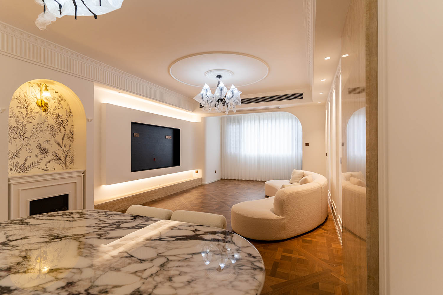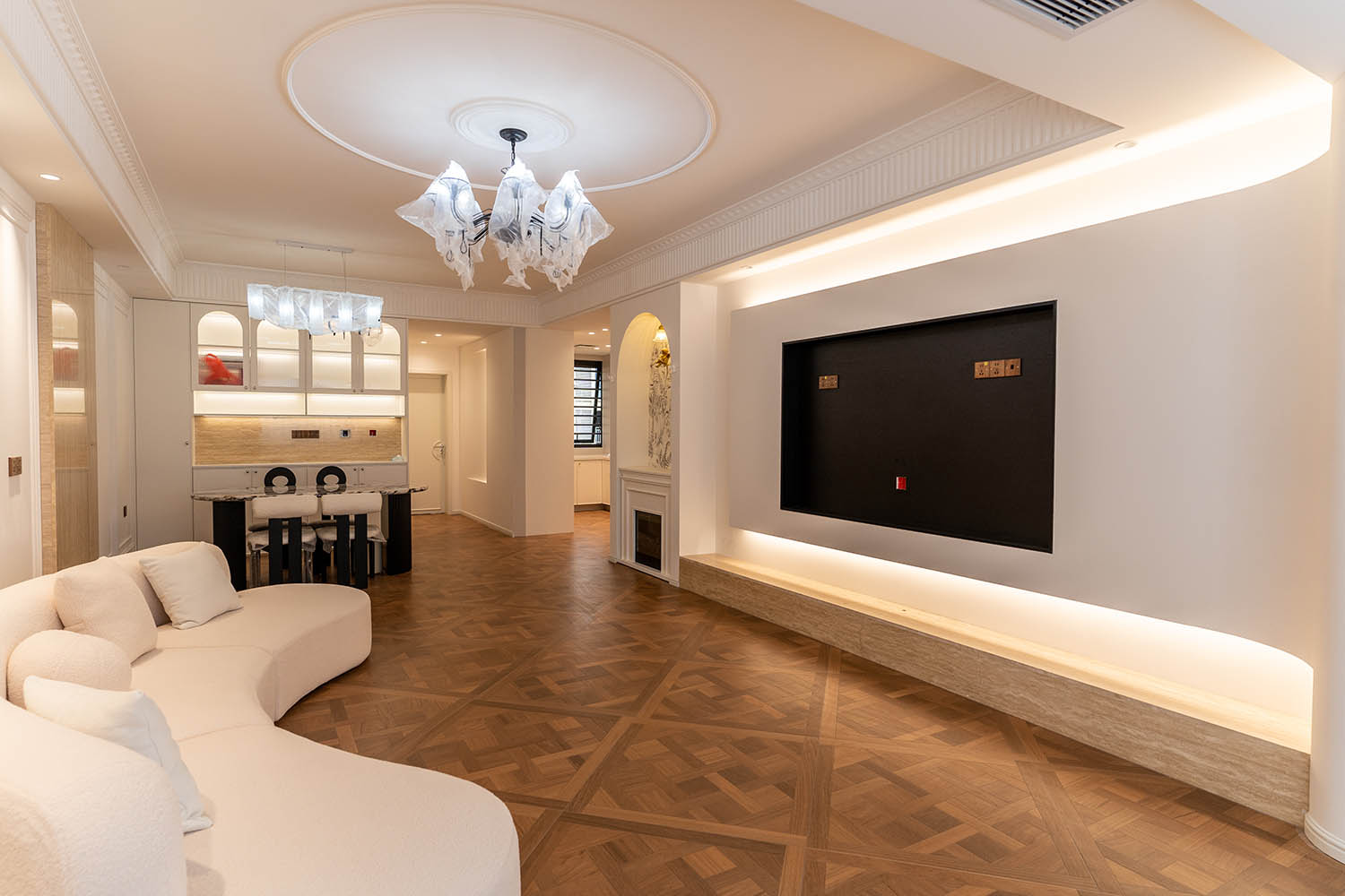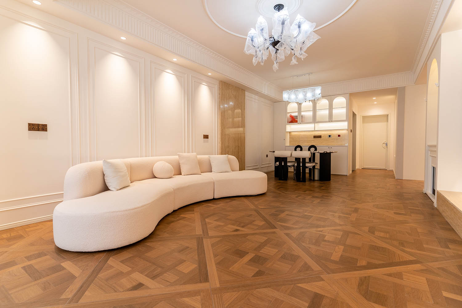 法式風(fēng)格以其優(yōu)雅的線條、精致的細(xì)節(jié)和浪漫的氛圍,成為高端家居設(shè)計(jì)的經(jīng)典選擇。它巧妙地將古典美學(xué)與現(xiàn)代生活需求相結(jié)合,創(chuàng)造出既有藝術(shù)感又實(shí)用舒適的居住環(huán)境。 對于133平米的戶型,法式風(fēng)格能充分發(fā)揮空間優(yōu)勢,通過對稱布局、精致雕花和優(yōu)雅配色,打造出充滿貴族氣質(zhì)與藝術(shù)氛圍的理想居所。 設(shè)計(jì)理念與空間基調(diào) 玫瑰御園133平米法式風(fēng)格的核心在于營造 “優(yōu)雅、浪漫、精致” 的生活氛圍。整體空間以淺色調(diào)為基底,采用米白、香草色、淺灰等優(yōu)雅色調(diào)作為主調(diào),為空間奠定明亮高雅的基調(diào)。